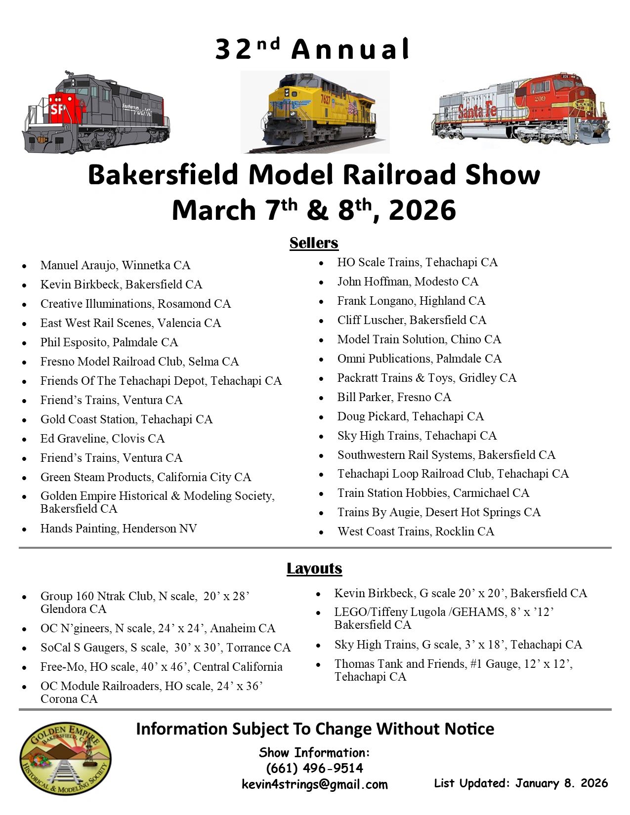 This is the list of attending sellers and layouts at the March 7 & 8, 2026, 32nd Annual Bakersfield Train Show. The list can be changed without notice so check back regularly for updated information.