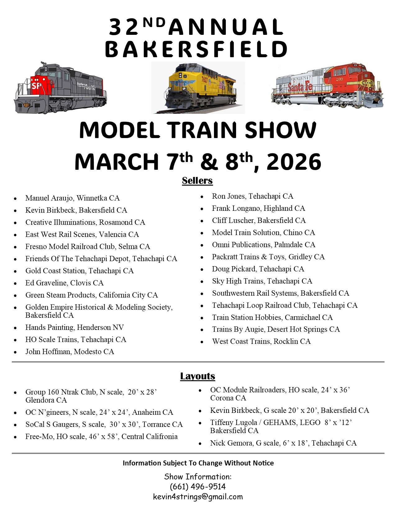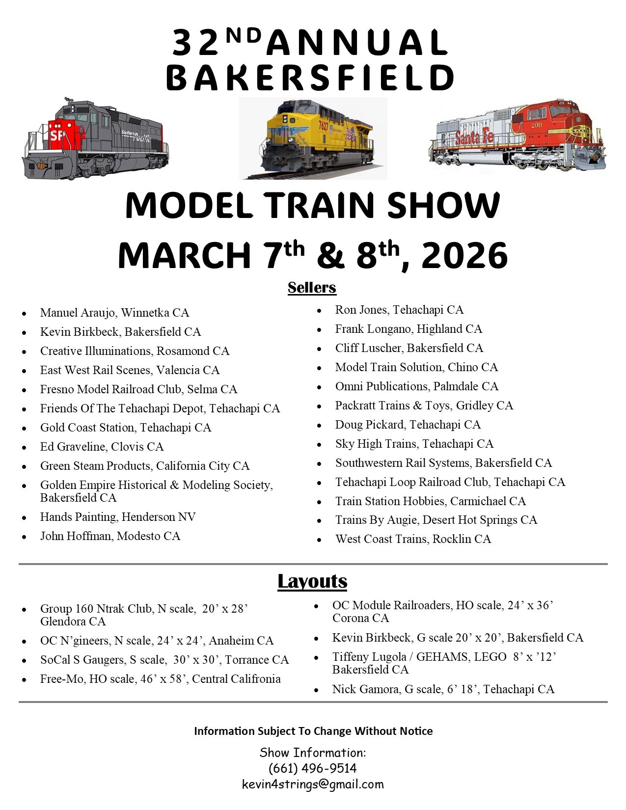 On the left is the list of attending sellers and layouts at the March 7 & 8, 2026, 32nd Annual Bakersfield Train Show. The list can be changed without notice so check back regularly for updated information.
